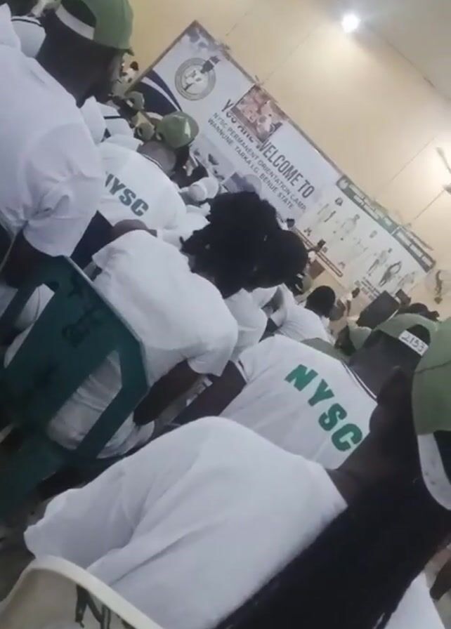 crowded room, likely an auditorium, with many people sitting in chairs. They are mostly facing forward, listening or watching something. Everyone visible is wearing a white shirt with "NYSC" printed on the back in green, along with green caps. A large banner behind them reads "YOU ARE WELCOME TO NYSC PERMANENT ORIENTATION CAMP WANIKSE, TAARKA LG BENUE STATE". The room is brightly lit by ceiling lights. The video seems to be taken from a low angle, showing the backs of the heads of people in the foreground. There is indistinct cheering in the background.