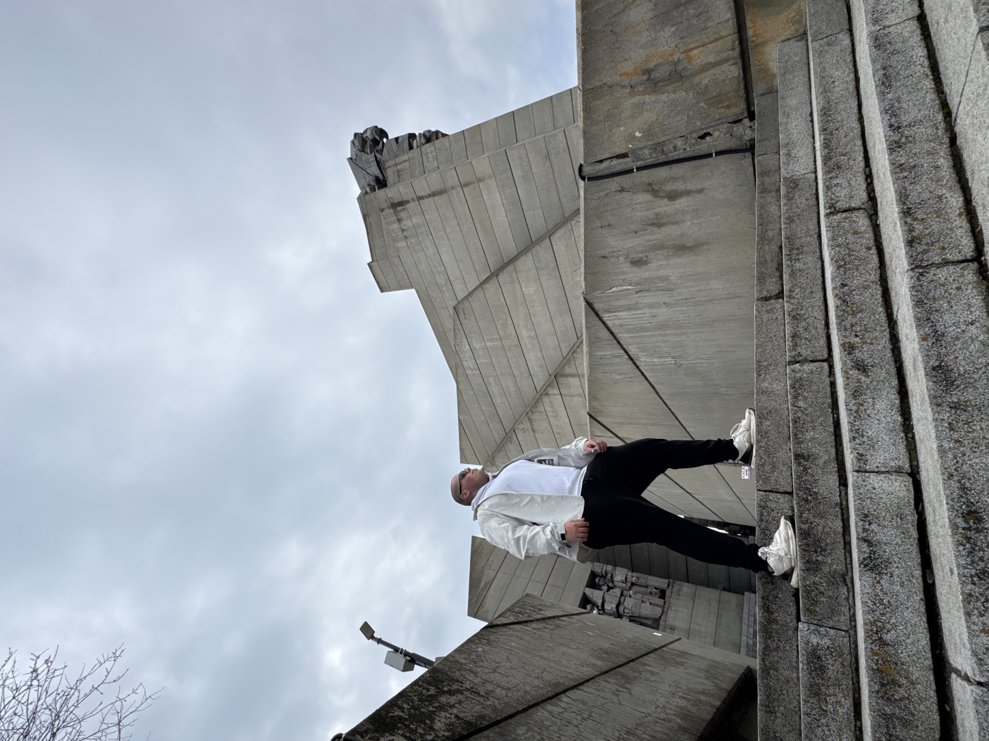 A male individual stands on wide, grey stone steps at the Monument to 1300 Years of Bulgaria in Shumen, Bulgaria