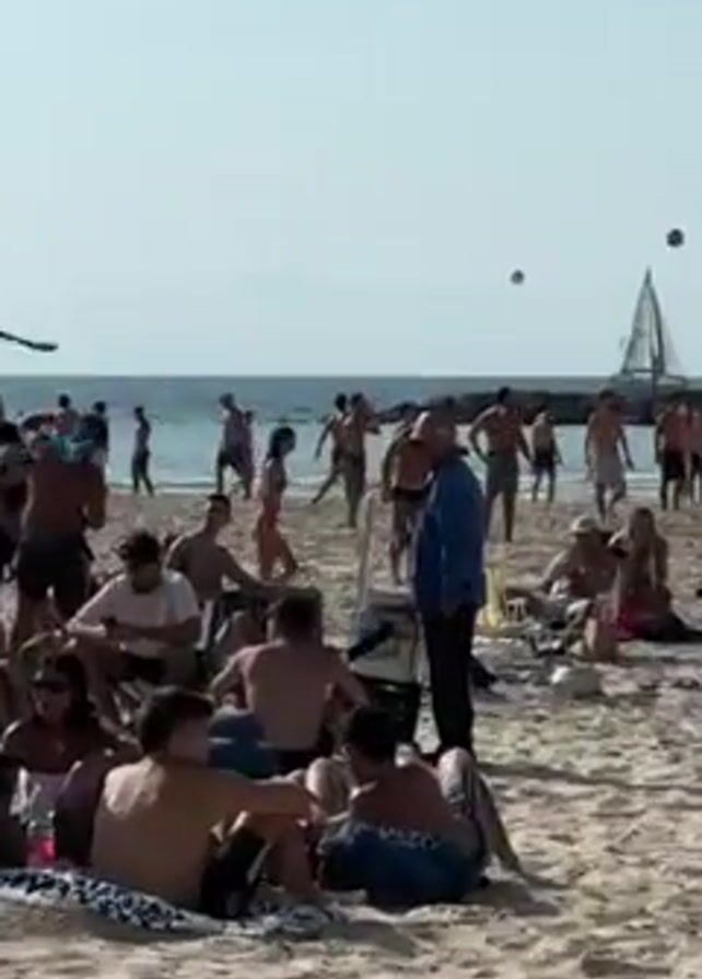 crowded beach on a sunny day. Many people are relaxing on the sand, some sunbathing and others sitting in groups. In the distance, people are playing in the water, and a sailboat is visible. A man wearing a hat and a blue shirt stands among the beachgoers, appearing to be vending something from a wheeled cart. The sky is clear, and the overall atmosphere is that of a busy summer beach day.