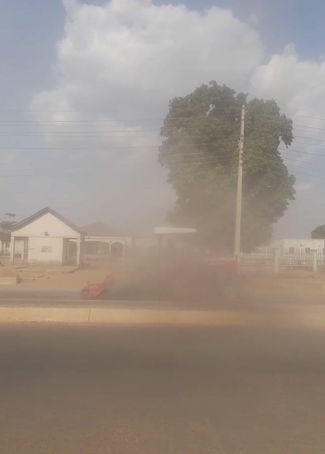 street with a large cloud of dust in the air, obscuring a tractor that appears to be the source of the dust