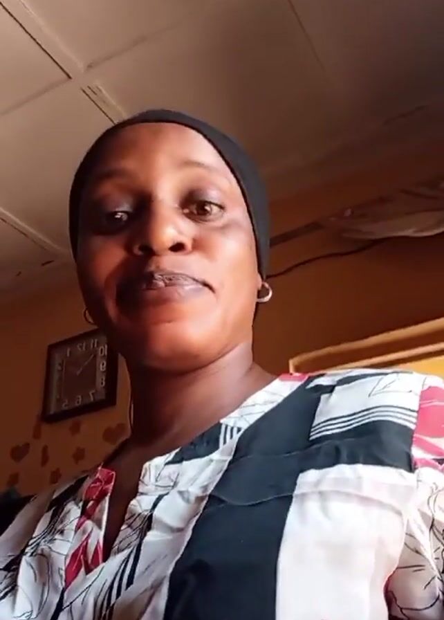 woman wearing a black head wrap and a patterned long-sleeved blouse. She appears to be indoors, with a wooden ceiling, a wall with a clock, and a door frame visible in the background. The woman looks directly at the camera and smiles slightly. She is positioned close to the camera, capturing her face and upper body.