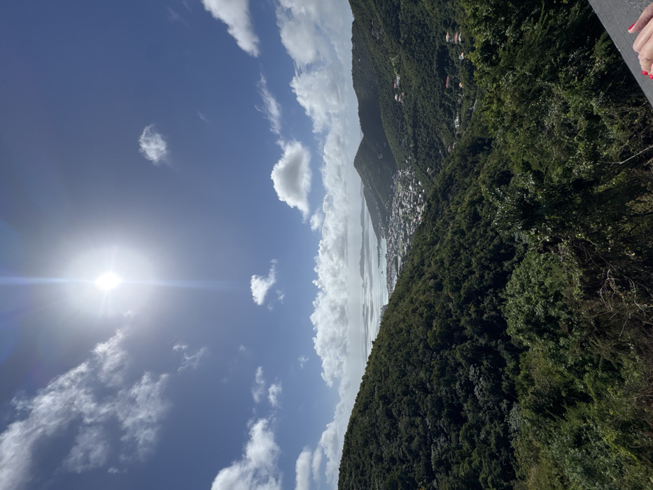 A scenic view of a lush, green mountainside, speckled with buildings, meeting a shimmering body of water. A bright sun shines in a partly cloudy blue sky, with its light reflecting on the water. The trees form a dense, tropical forest covering the hillsides. The image is slightly tilted, giving a dynamic perspective.