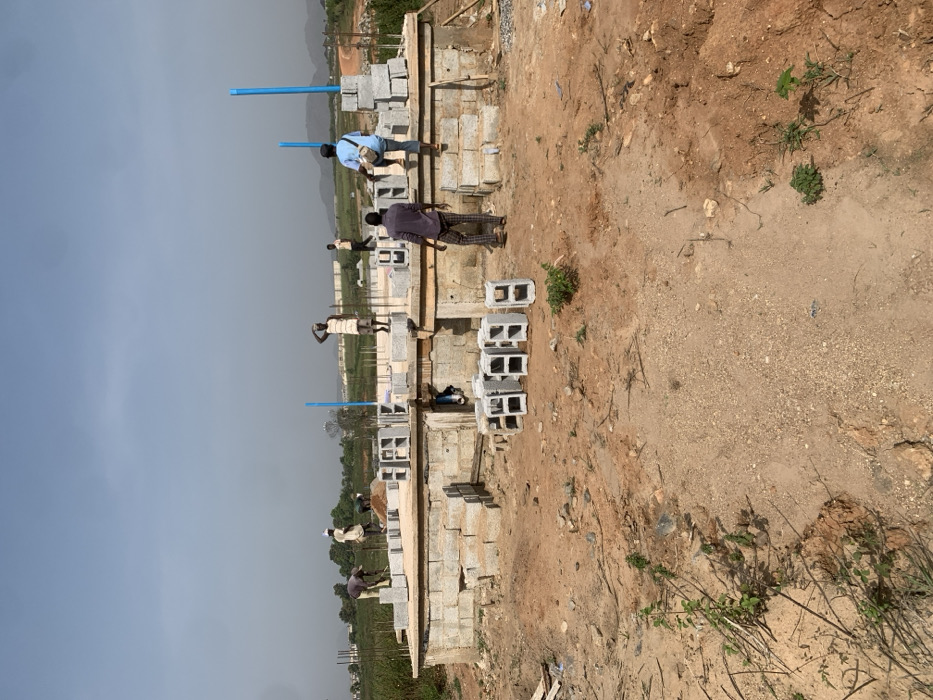 This image depicts an active construction site in Karsana 2, Nigeria, under a clear, pale blue sky. The central subject is the foundation and initial wall construction of a building, comprising grey concrete blocks forming a raised platform approximately 1.5 to 2 meters high. Exposed vertical rebar protrudes from the top surface, along with some blue PVC pipes. Several stacks of unused concrete blocks are visible on the ground directly in front of the structure. Eight adult males, all appearing to be laborers, are present on the site. * Two individuals are positioned on the far left, bending over, seemingly engaged in ground-level work near a pile of sand/dirt. One wears a light-colored long-sleeved shirt and trousers, the other a similar top and dark trousers. * Another individual, wearing a light shirt and dark trousers, stands behind the ground-level work area, observing. * A fourth individual, wearing a white shirt and light-colored shorts, stands on the constructed platform, wiping his forehead with his right hand. * A fifth individual, wearing a dark shirt and checkered trousers, stands at the base of the platform, facing towards it. * A sixth individual, wearing a blue shirt and light-colored trousers, is crouched or seated on the far right edge of the platform, near a stack of blocks. * Two additional individuals are partially visible in the mid-ground, one standing near the structure on the left side, another further back near the distant tree line. The ground around the construction is dry, reddish-brown earth with sparse, short green vegetation. In the background, a flat plain transitions into low, distant hills or mountains under a hazy horizon. There are indications of further development or infrastructure in the distance, including what appears to be a wall or fence line and cleared land.