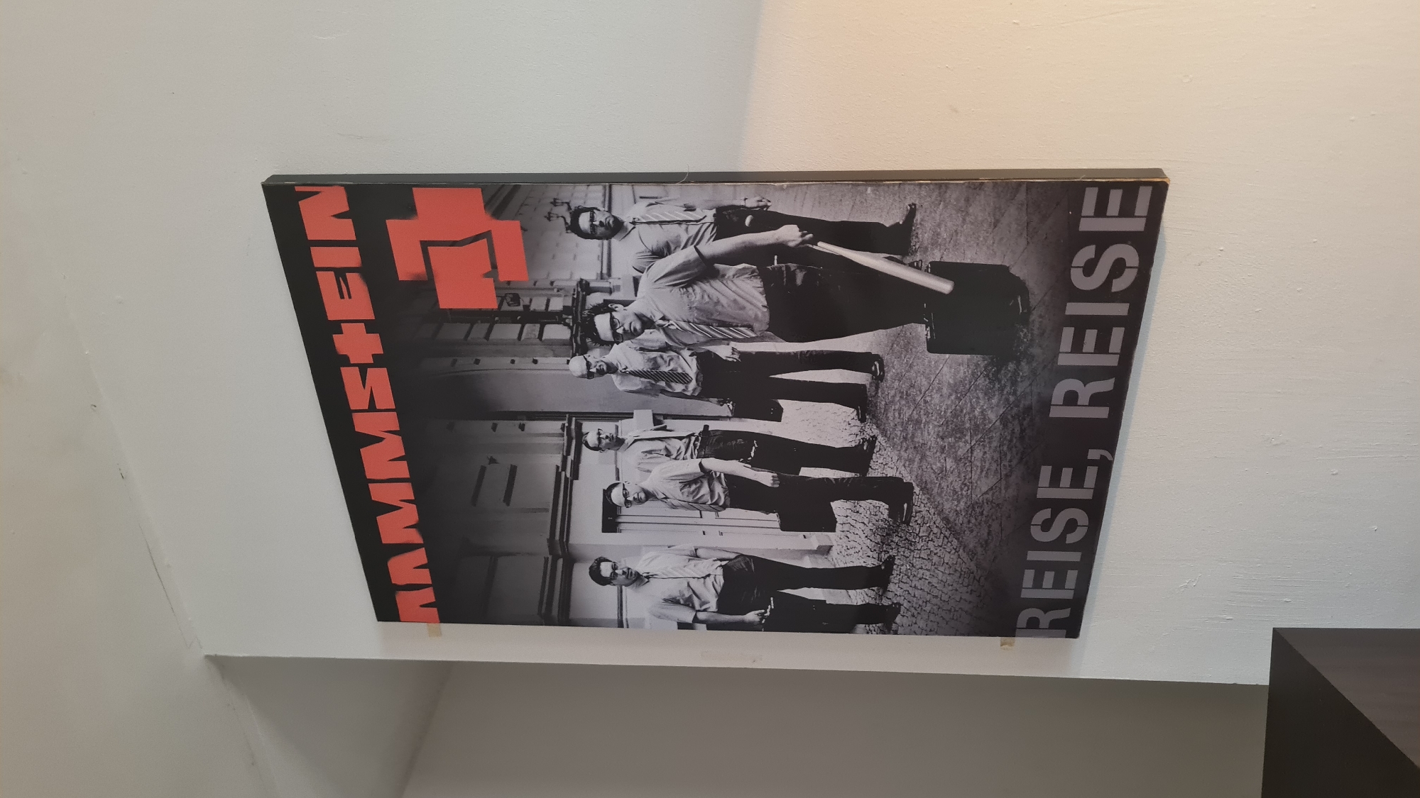 A vertical, rectangular print featuring the Rammstein "Reise, Reise" album cover is mounted flat against a plain, light-colored wall
