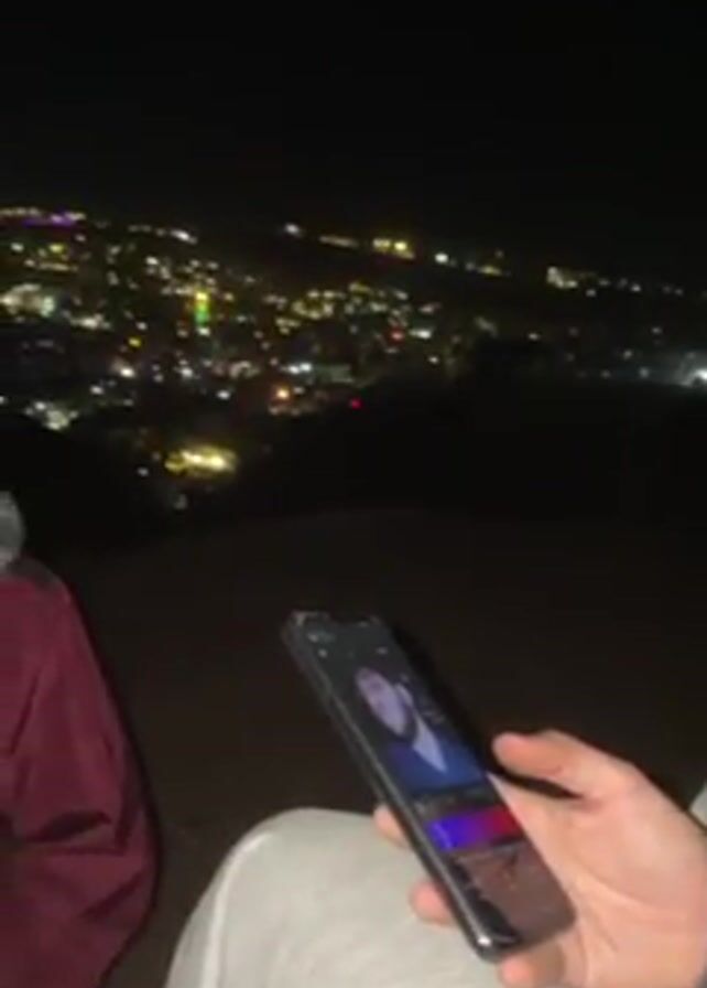A person in light-colored clothing is holding a mobile phone, with another person next to them in a burgundy jacket, in front of a city nightscape. The person in the jacket raises their hand with three fingers up, then speaks. Another person in a white shirt stands to the side. The moon is visible in the sky.