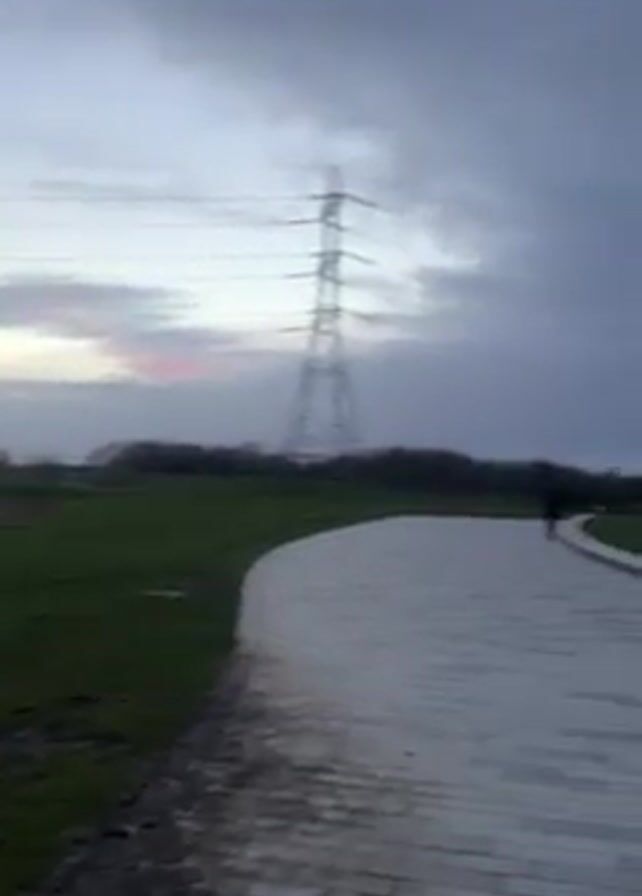 grey, overcast day at a park. The camera starts focused on a patch of grass and a winding pathway before panning to the right, revealing two massive metal horse head sculptures, The Kelpies, in the distance. The sculptures appear silver in color, with a complex, geometric design. The sky is filled with dark clouds, and power lines are visible in the background. Someone is walking along the pathway towards the sculptures. The camera continues to pan across the sculptures, providing different angles of the horse heads against the backdrop of the cloudy sky and the surrounding park.