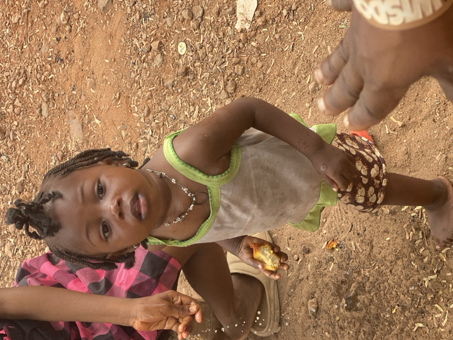 The scene is set outdoors on reddish-brown dirt ground with scattered small pebbles and organic debris in Adankolo, Nigeria