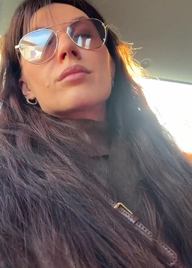 A woman with long brown hair and bangs is wearing sunglasses in what appears to be a car