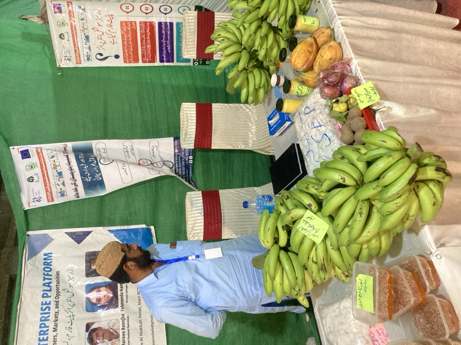 This image depicts an indoor market or exhibition stall showcasing agricultural products. A single adult male stands behind a table laden with items. The exact location within Quetta City Tehsil, Pakistan, is not discernible from the image; however, one banner prominently displays an address for "New Al Makkah Hotel, Main RCD Road, Loralai, Balochistan." The male subject, positioned on the left, has a dark beard and wears a light blue collared shirt with a brown-patterned cap. A blue lanyard with a white identification card is suspended around his neck. His hands are clasped behind his back, and his gaze is directed to the right, slightly downward. He appears to be observing the scene or waiting. The table in the foreground is covered with a light-colored tablecloth and displays a variety of fresh produce and packaged goods. These include numerous bunches of green bananas, some with small yellow price tags bearing Urdu text. Other items present are multiple clear plastic containers filled with a reddish-brown, semi-solid substance, a bottled water (Purelife brand), a black notebook, a blue box of facial tissues, a clear bag containing small white granular items labeled "SEP," several small jars of yellow powder (possibly spice), whole papayas, and a red basket holding potatoes, red onions, and lemons. In the background, three white chairs with red sashes on their backs are visible. Three large banners serve as the backdrop: the left banner (partially visible) promotes an "ENTERPRISE PLATFORM" with names and roles of "Director Business Operations" and "Director Linkages," along with the Loralai address. The middle and right banners feature logos from organizations such as the International Trade Centre, European Union, and GRASP (Growth for Rural Advancement and Sustainable Progress), accompanied by Urdu text and diagrams related to social enterprise platforms and development projects. The entire setup is against a plain green fabric wall.