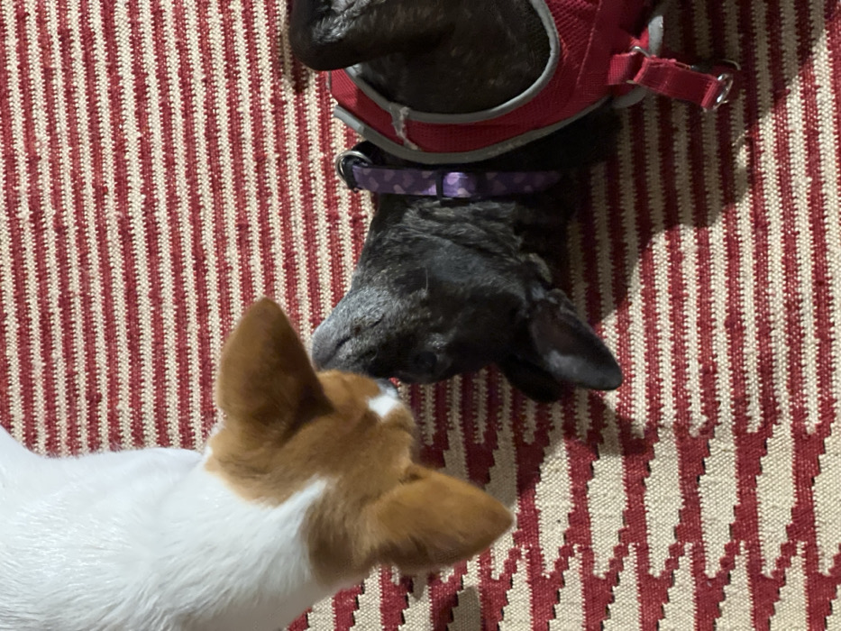 Two dogs are lying on a red and white striped rug. One dog is tan and white and only the head and part of the body are visible. Its ears are erect. The second dog is black and facing away from the first. The dog is wearing a red harness and a purple collar. The rug appears to be woven.