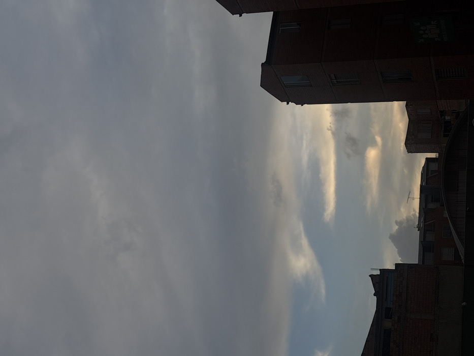 A low-angle shot shows buildings framing a clouded sky. The buildings are made of red brick and have several windows. The sky is mostly grey with lighter, almost golden clouds interspersed, creating visual contrast. The image is rotated, giving a slightly disorienting perspective.