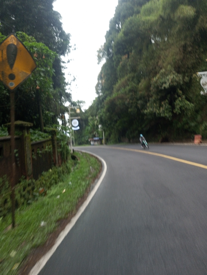 The scene depicts a curving asphalt road within the city of Deothang, Bhutan, captured from a moving perspective. The dark gray road features a solid white line on its left edge and a solid yellow line near its center. On the immediate left, a yellow diamond-shaped warning sign with a black exclamation mark is mounted on a brown pole. Behind this sign, a low, moss-covered concrete or stone wall parallels the road, with dense green grass and undergrowth between the wall and the road. Tall, dark green trees line both sides of the roadway, creating a dense forest environment overhead, with an overcast white sky visible through the canopy. In the mid-distance, a lone individual wearing a light blue helmet and dark clothing is riding a bicycle on the right side of the road, moving away from the camera. Further along the curve, indistinct structures are partially visible through the trees on the right, and a circular white sign is discernible above the road on the left.