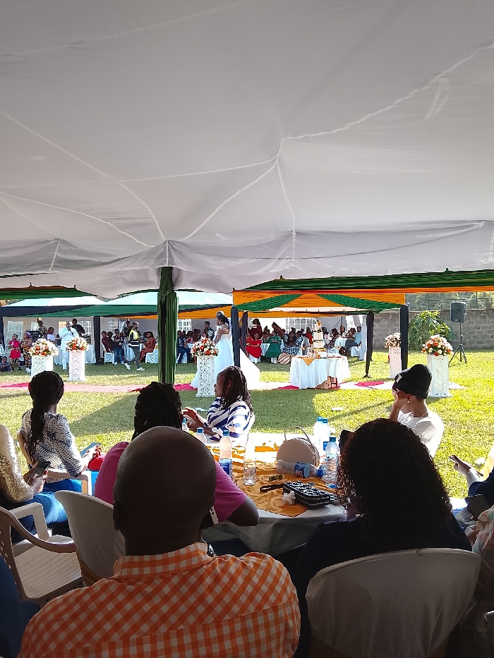 Under a white canopy, an outdoor event unfolds on green grass. A central aisle leads to a decorated table, flanked by flower-topped pillars. Attendees gather, some seated at tables closer to the camera, others in chairs lining the aisle. The backs of seated individuals dominate the foreground, while the main event, possibly a wedding, is visible in the distance with people standing and a cake table. The scene is bathed in natural light.