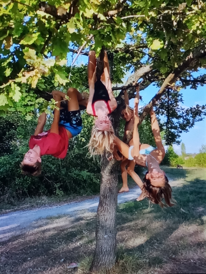 Four individuals are depicted hanging upside down from the branches of a deciduous tree in an outdoor setting in Lutynia, Poland
