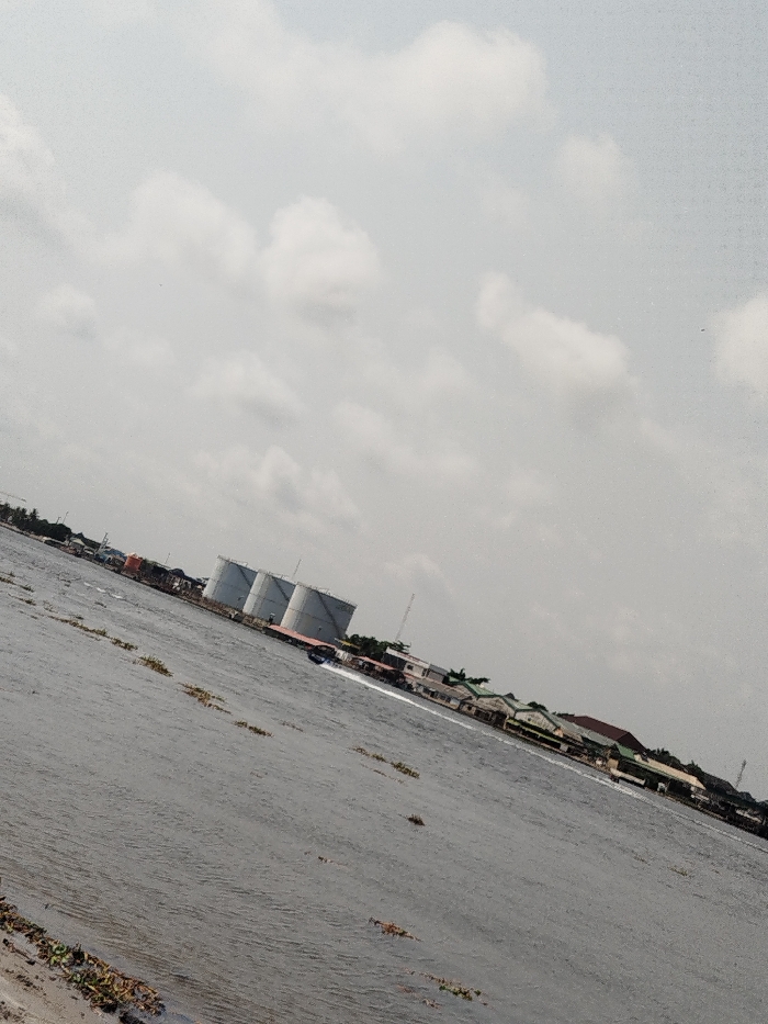 A tilted photograph captures a scene in Ibasa, Nigeria, dominated by a body of water under an overcast sky with scattered white clouds