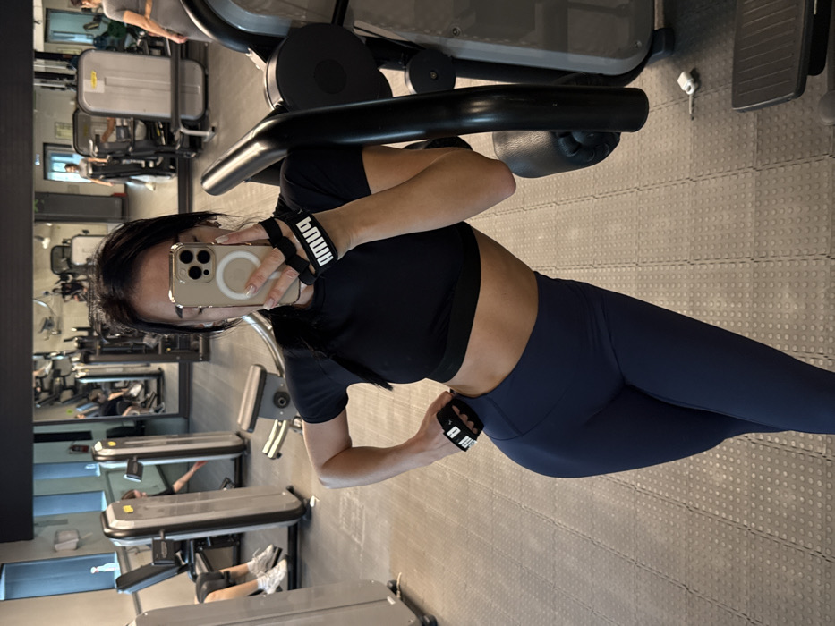 A woman is taking a selfie in a gym. She wears a black crop top, dark leggings, and Puma workout gloves. Her dark hair is pulled back. The gym has various weight machines, treadmills, and a mirrored wall, reflecting the equipment and other gym-goers. The floor is tiled in a gray, geometric pattern.