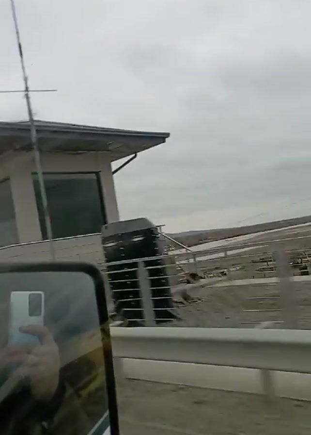 view from inside a moving vehicle, likely a car, as it crosses a bridge. The camera is positioned to the side, capturing the side mirror in the foreground, which reflects a person holding a smartphone. The background consists of a grey, overcast sky and a landscape of flat, open land with a wide, shallow river or body of water. The vehicle passes a speed limit sign indicating 40 km/h, followed by a modern building with a glass-enclosed area and a railing. As the vehicle progresses, the bridge structure becomes more apparent, with steel railings visible. The environment appears bleak and industrial, possibly an area under construction or development.