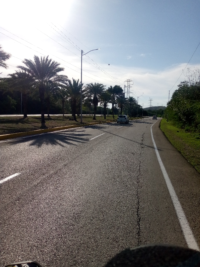 The image displays an asphalt road under a bright sky with the sun visible in the upper left. The scene is located in La Asuncion, Venezuela. The road, featuring white lane markings and a distinct white line on its right edge, curves gently to the right as it extends into the distance. On the left side, a grassy median separates the road from a row of palm trees. These trees cast prominent shadows across the asphalt. A yellow curb delineates the left edge of the road. Utility poles equipped with streetlights and carrying multiple power lines parallel the road on the left. Further down the road, a light-colored compact sedan is present on the left lane, moving away from the viewer. A second, darker vehicle is visible at a greater distance on the right lane, also proceeding away. The right side of the road is bordered by a green, overgrown embankment of bushes and foliage. In the background, several tall metal lattice transmission towers are visible against distant hills. The immediate foreground, at the bottom center of the image, is occupied by a dark, textured, curved object, likely a component of the vehicle from which the photograph was taken. A partial yellow object with dark markings is visible on the left edge of this foreground element. No individuals are present in the scene.