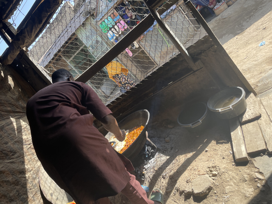 The image depicts an outdoor cooking operation in Kaura Goje, Nigeria, under direct sunlight