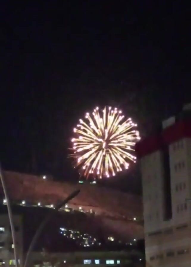 firework exploding in the night sky. The firework is a bright gold and orange color, and it explodes in a radial pattern. The background of the video includes buildings, hills, and streetlights. A few lights appear on a hillside in the background, indicating buildings and possibly a road. A building with a red top is also visible in the frame. After the explosion, the firework fades away, leaving only a few embers in the sky. The sound of a vehicle passing by can be heard at the beginning of the video.