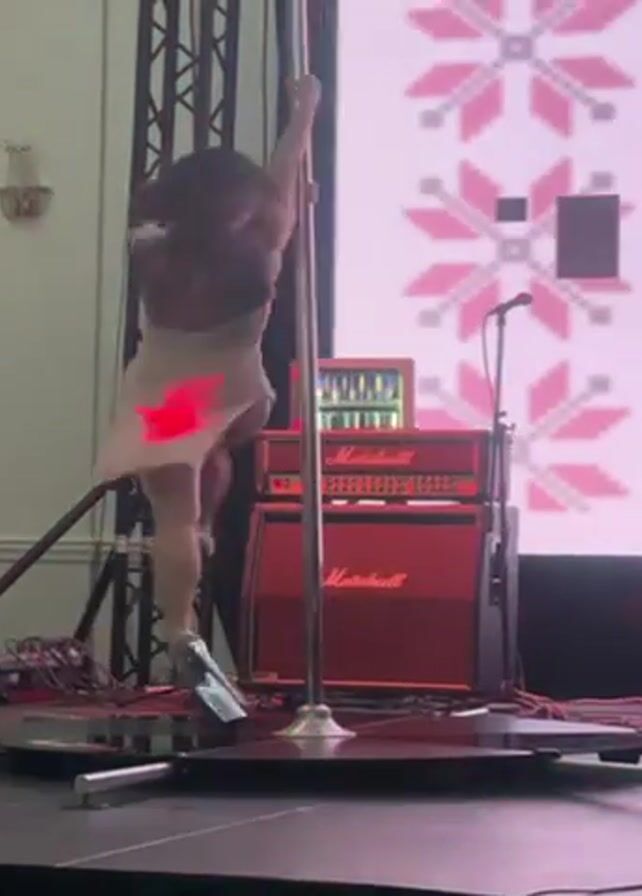 A woman in a pink dress and silver heels performs pole dance on a stage. The background features a screen with a geometric snowflake pattern and the word "FIRST" on it. Two Marshall amplifier speaker boxes are behind the pole. The stage is illuminated with red lights, and microphone stands are also visible. She moves quickly and confidently on the pole.