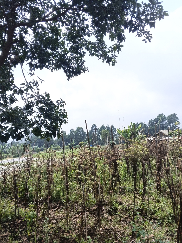 The image captures an open-air agricultural or rural landscape in Mong Pun Teing, Myanmar, under an overcast sky. In the foreground, a field contains numerous rows of dried or mature plants, primarily brown and dark green, supported by vertical wooden stakes approximately 1 to 1.5 meters in height. The ground beneath these plants consists of dark soil with sparse green vegetation and scattered dry organic matter. A substantial tree branch with dense, dark green foliage extends into the upper left quadrant of the frame. In the midground, a wide, light-colored expanse, possibly a dry riverbed or dirt track, is visible. Beyond this, a prominent cluster of large-leafed banana trees stands amidst other green foliage. The background features a dense line of tall, dark green coniferous trees. To the far right, a structure with a light-colored, multi-tiered roof and visible walls is partially discernible. The sky, occupying the upper two-thirds of the image, is uniformly light grey and cloudy. No individuals, actions, or specific interactions are present in the scene.