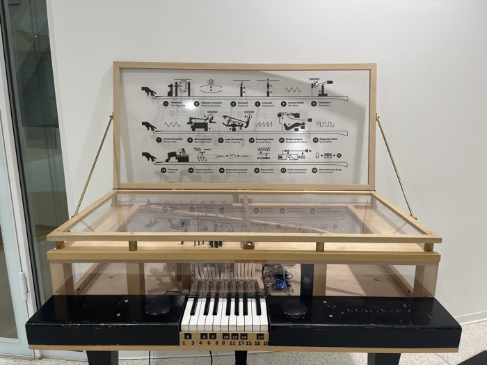 An interactive sound synthesis exhibit stands against a plain white wall in an indoor public exhibition space in Budapest, Hungary