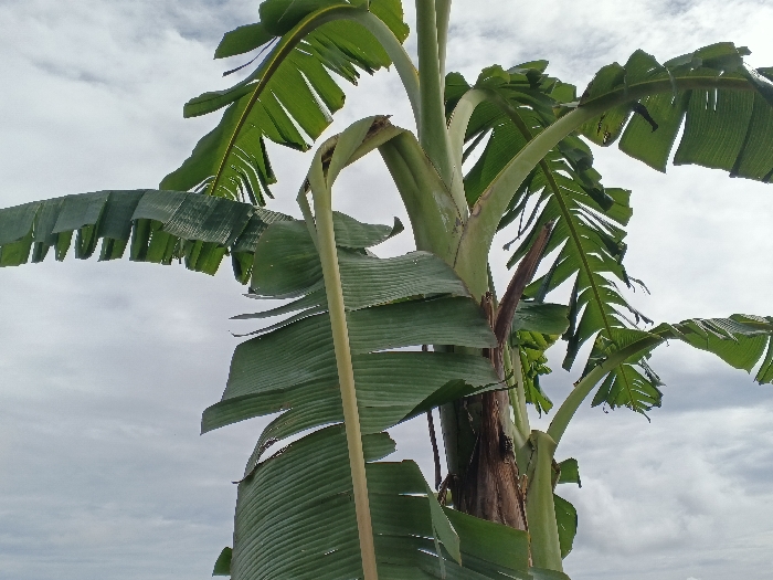 A banana tree dominates the frame, its thick, layered leaves a vibrant green against a cloudy sky