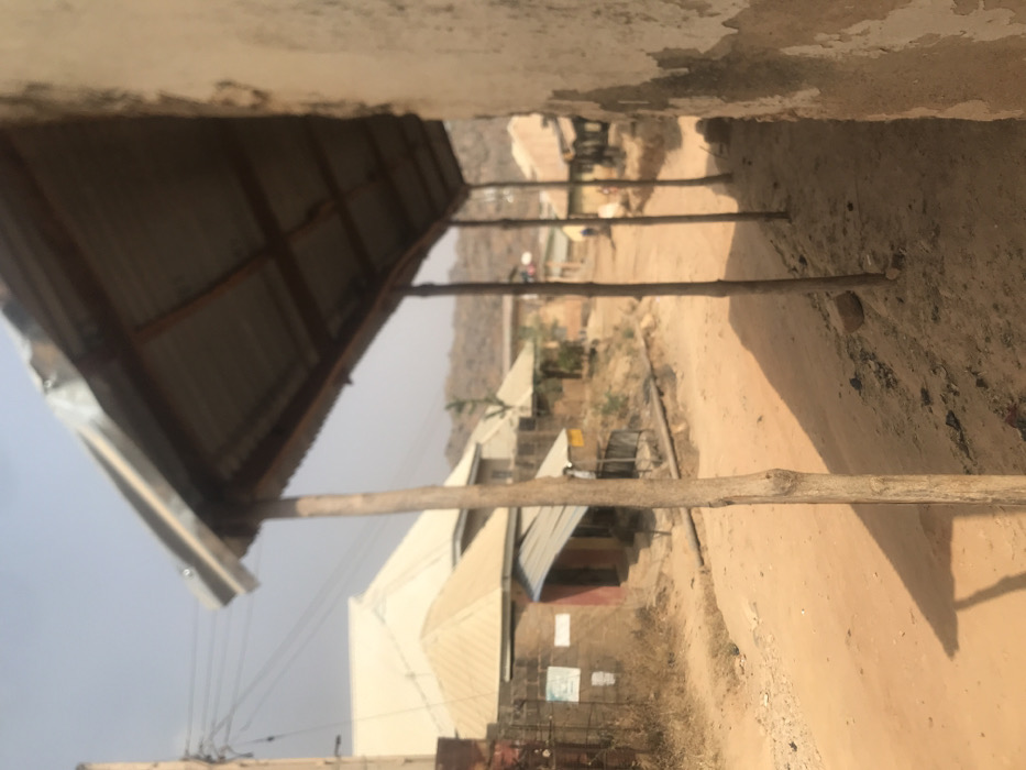 The image depicts a rural or semi-urban street scene on Rukuba Road, Nigeria, under what appears to be bright daylight. The foreground on the right features a weathered, light-colored wall, possibly mud or concrete, exhibiting peeling paint or plaster. Extending from this wall is a makeshift canopy constructed with a corrugated metal roof supported by several slender, unprocessed wooden poles. These poles cast distinct shadows onto the sandy ground to their left. The street itself is an unpaved, reddish-brown dirt road, sloping gently downwards and away from the viewer. On the left side of the road, several structures are visible. Immediately across the road, a brick or mud-walled building with a corrugated metal roof is present, featuring what appears to be posters or signage affixed to its exterior. Further back, another building with a light-colored, possibly metal, hip roof is seen. A power pole with multiple utility lines is visible on the far left. In the mid-ground, further down the dirt road, more residential or commercial structures with various roof types (mostly corrugated metal) line both sides. Several indistinct figures, likely pedestrians, are visible in the distance on the road, suggesting activity. The general environment is dusty. In the background, a range of hills or mountains is faintly visible under a hazy sky. No specific, identifiable actions or interactions between individuals are clearly discernible due to distance and focus.