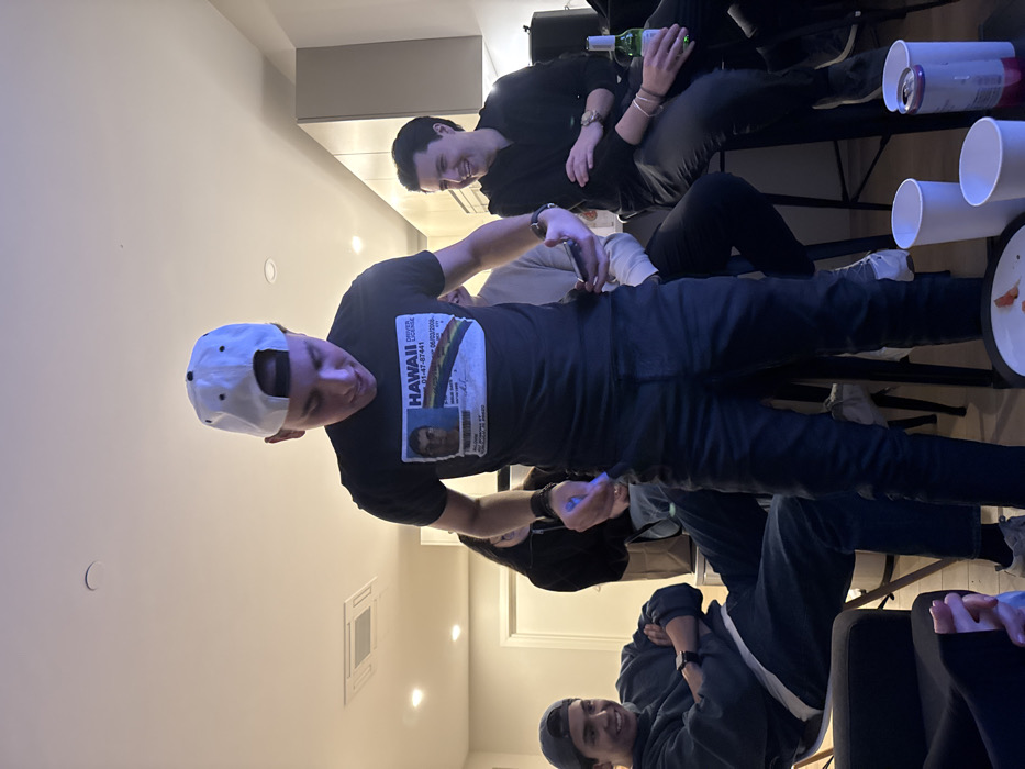Several people are casually gathered indoors. One man wears a black t-shirt with a Hawaiian driver's license graphic, paired with a white baseball cap and dark pants. Another man seated on a barstool holds a green bottle, while someone next to him is holding a canned beverage. A makeshift beer pong table with cups is visible. The overall setting suggests a casual get-together or party.