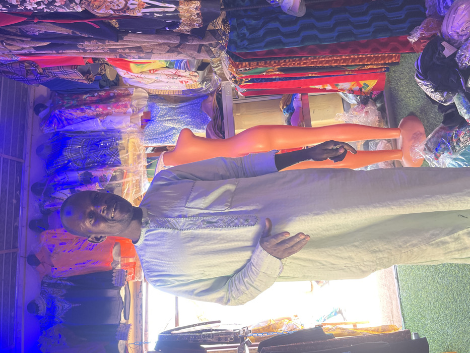 An adult male stands centrally within a brightly lit clothing shop in Samaru, Nigeria