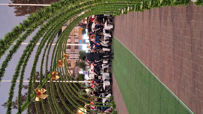 A Christmas-themed outdoor space features arched green garlands adorned with gold bows, creating a tunnel-like pathway
