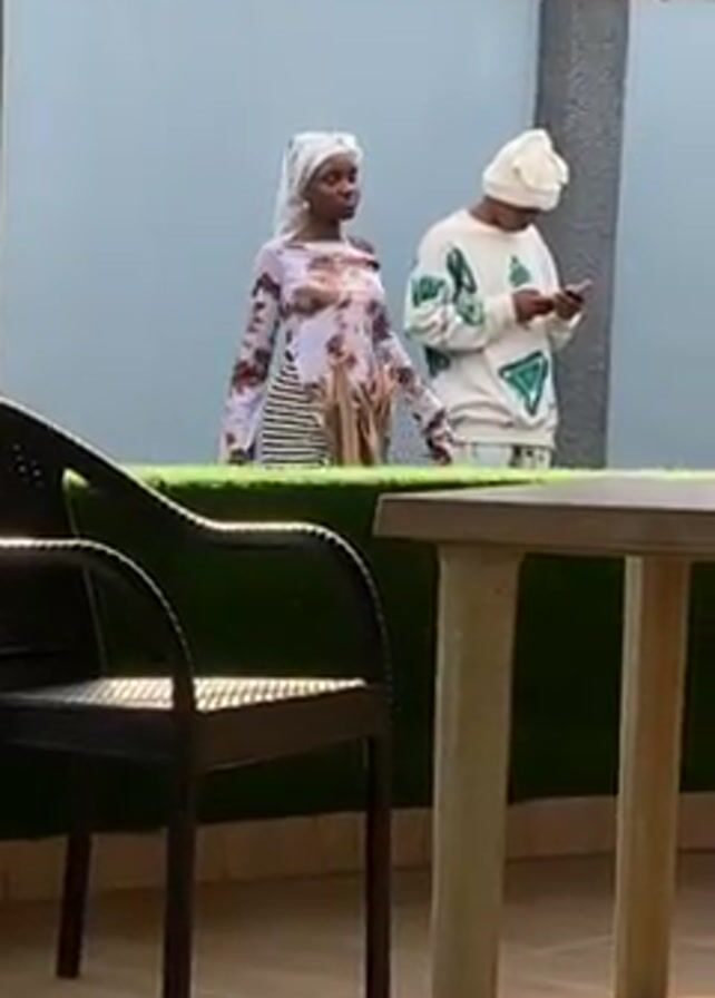 two people in what appears to be an outdoor setting. A woman wearing a head covering, a brown and white patterned top, and a black and white striped skirt stands next to a man who is looking at his phone. He is wearing a white sweatshirt with green designs and a white head covering. They are standing in front of a light blue wall with a patch of artificial green grass. A black plastic chair and a plastic table are in the foreground, partially obstructing the view of the two people.