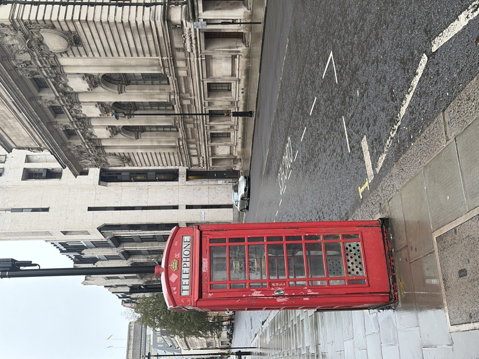 The image displays a static urban street scene on Bartholomew Lane, City of London, United Kingdom, under an overcast sky, with all surfaces wet from recent precipitation. In the immediate foreground, a red K6 telephone kiosk occupies the left side of a grey flagstone pavement. The kiosk features "TELEPHONE" signage above a crown emblem, glass paneled walls, and a "PULL" handle on its door. Small puddles are present around its base. Adjacent to the pavement, the asphalt roadway is visibly wet, reflecting light. White dashed lane markings are painted on the road, along with a partial "COUNTER" text and a yellow "T" symbol near the curb. A silver two-door sports car, identified as a Porsche, is positioned on the right side of the road, facing away from the viewer, with its license plate (ending "WYY") visible. The right side of the street is defined by a large, ornate, classical-style building constructed of light-colored stone, identified as part of the Bank of England. This structure features multiple arched windows, prominent columns with classical capitals, decorative friezes, and a dark entrance door. A black lamppost stands on the pavement directly in front of this building. On the left side of the street, behind the telephone kiosk, a tall, modern building with a light-colored, multi-paneled facade and prominent vertical architectural elements is visible. Further down the street on the left, additional urban buildings recede into the distance. A tall, dark pole equipped with communication antennae rises behind the telephone kiosk. No individuals are present in the scene.