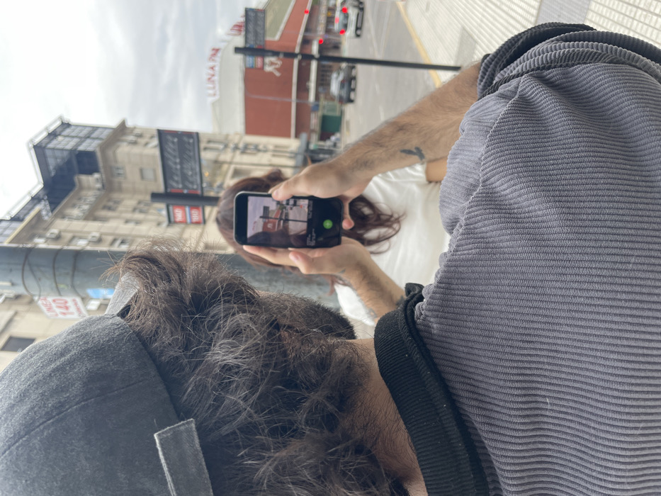 An outdoor urban scene in Buenos Aires, Argentina, depicts two individuals on a city sidewalk. The location is identifiable by the prominent red "LUNA PARK" building in the background and a "LÍNEA 140" sign on a street pole. In the immediate foreground, a person is observed from behind, wearing a dark gray baseball cap and a dark gray ribbed corduroy collared shirt. They have dark, curly hair visible beneath the cap. Directly in front of this individual, a second person with long, dark hair and a white t-shirt faces the viewer, holding a dark-colored smartphone horizontally with both hands. Their face is obscured by the phone. A dark, avian-like tattoo is visible on their right forearm. The smartphone's screen displays an image of a street environment, with a green icon visible, indicating an active camera function or media review. The background features typical urban infrastructure, including multiple-story buildings, a grey street pole with attached white signs, and vehicles on an asphalt street. The sky is overcast, providing diffused light. The foreground consists of a light-colored, patterned sidewalk.