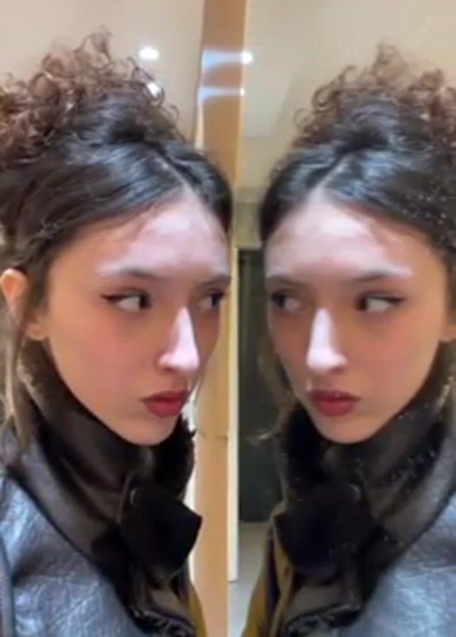 A young woman with curly brown hair in an updo, wearing a black jacket, stands next to a mirror