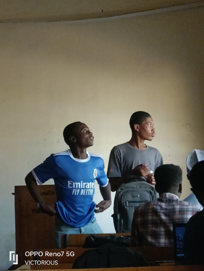The image depicts an indoor scene in Dutse, Nigeria, featuring two young males standing in the mid-ground against a light beige wall