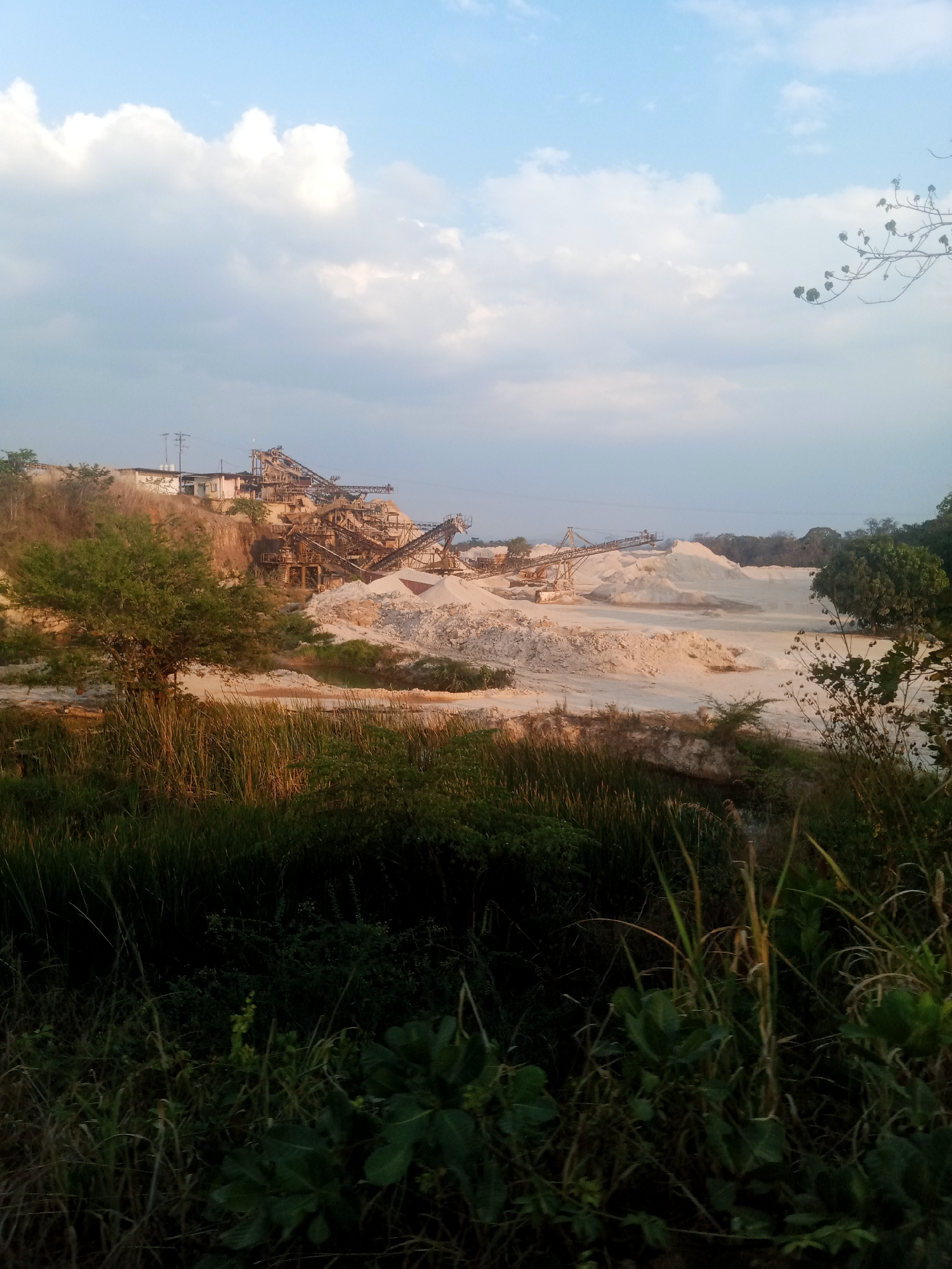 quarry in Marta, Venezuela. Mining machinery sits atop a small hill with several conveyor belts. Large piles of light-colored material, presumably mined product, are present. In the foreground is a ditch or shallow water feature lined with vegetation. The sky is pale blue with scattered clouds. There are no visible people or animals.
