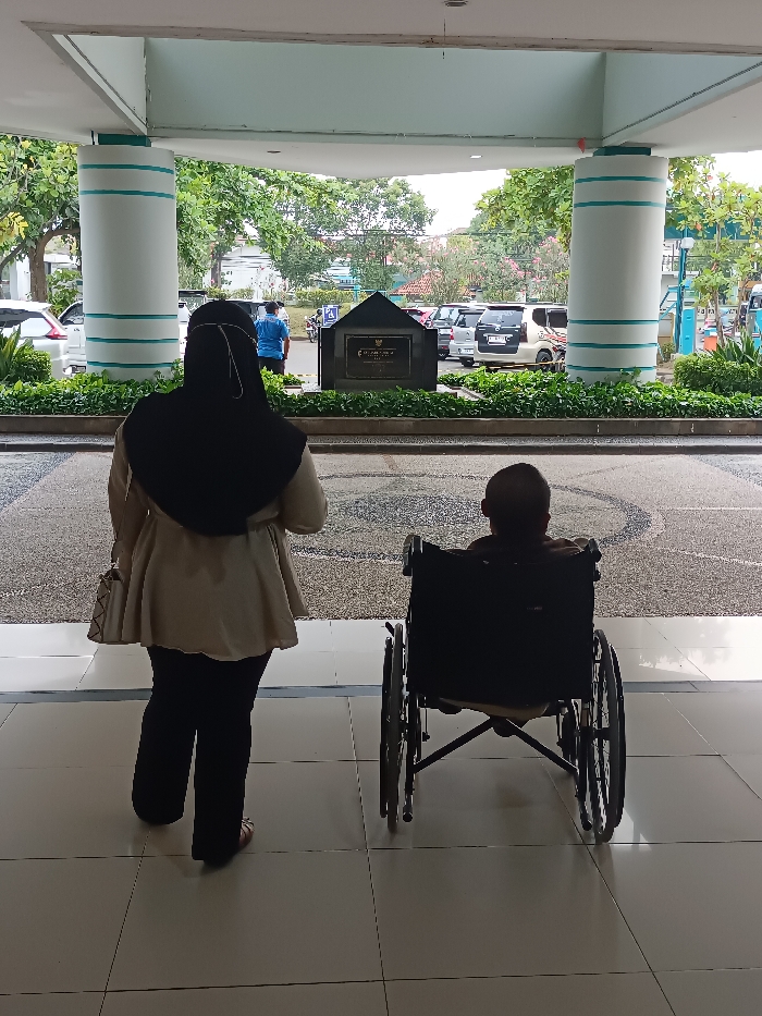 The image displays an outdoor scene at the entrance of a building, likely a hospital or clinic, located in Margorejo, Indonesia. In the immediate foreground, two individuals are positioned with their backs to the viewer, facing outward towards a parking area. On the left, a person, presumably female, stands on a light-tiled floor. They are wearing a black headscarf, a beige tunic, black pants, and light-colored open-toed footwear. A light-colored handbag is carried on their left arm. To the right of this person, a black manual wheelchair is present. Seated in the wheelchair is another individual, seen from behind, with the back of their head and shoulders visible, wearing dark clothing. Beyond the tiled floor, the scene transitions to a paved outdoor area beneath a large canopy supported by two white cylindrical pillars, each decorated with horizontal teal stripes. A low green hedge delineates the boundary between the immediate area and a central, dark-colored, monument-like structure with a pointed roof, which appears to be an informational plaque. The background shows an expansive parking lot occupied by various parked cars and vans. Green trees and foliage are abundant throughout the background. A person in a blue shirt is visible standing near a white vehicle on the left side of the parking lot. On the right, a blue sign with a white wheelchair symbol indicates accessibility. The sky above is overcast.