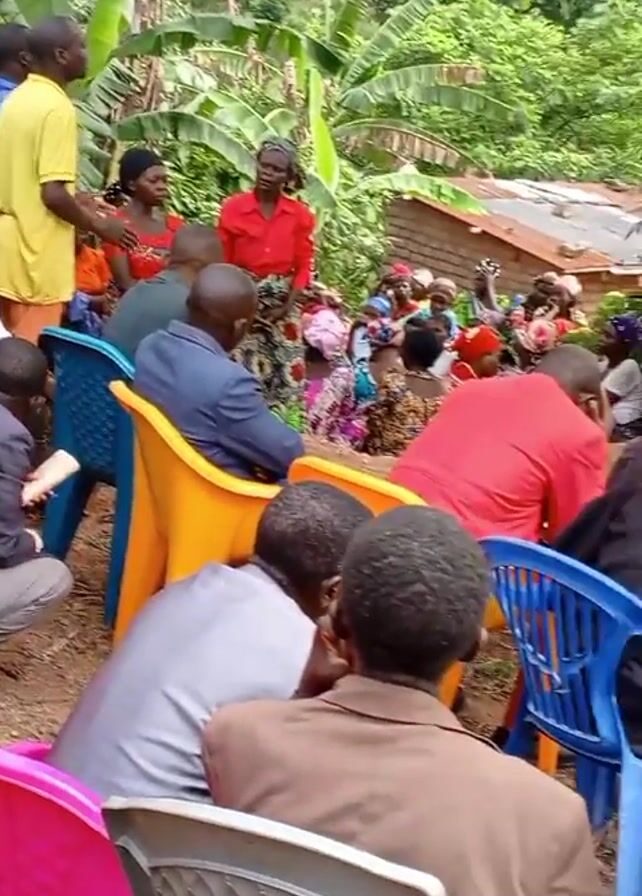 n outdoor gathering of people, possibly a funeral or memorial service. The attendees, mostly adults, are dressed in a variety of clothes, including suits, dresses, and casual wear. They are seated on chairs and on the ground, facing a table draped with a patterned cloth, presumably holding a coffin or other memorial object. The environment appears to be a rural or semi-rural area with trees and banana plants in the background. Some people are looking toward the table while others are looking around. There is a sense of solemnity and community among the people gathered.