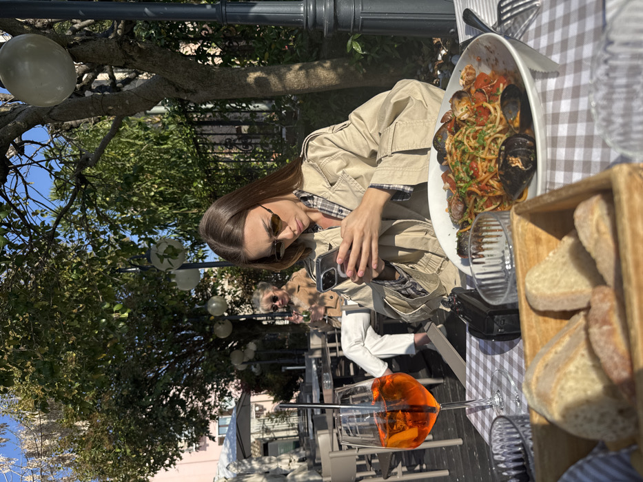 An outdoor dining scene in Sirmione, Italy, features two women at separate tables under natural light. In the foreground, a young woman with long brown hair and dark sunglasses wears a beige trench coat over a plaid shirt. She is actively engaged with a smartphone, held in both hands, positioned over a table set with a white and light brown checkered tablecloth. On her table, a large white bowl contains spaghetti with mussels, clams, and a tomato-based sauce. To the left, a tall glass holds an orange beverage with ice, an orange slice, and a metal straw. A wooden basket of sliced bread and a clear ribbed glass are also visible on the table. To the main subject's right, a black compact camera-like device rests on the tablecloth. In the mid-ground, a second woman with blonde hair, sunglasses, and a tan coat is seated at another table, holding a small glass. The environment includes a background of green trees, street lamps with spherical white diffusers, and a black metal fence. Distant buildings are partially visible under a clear blue sky, indicating bright, sunny conditions.