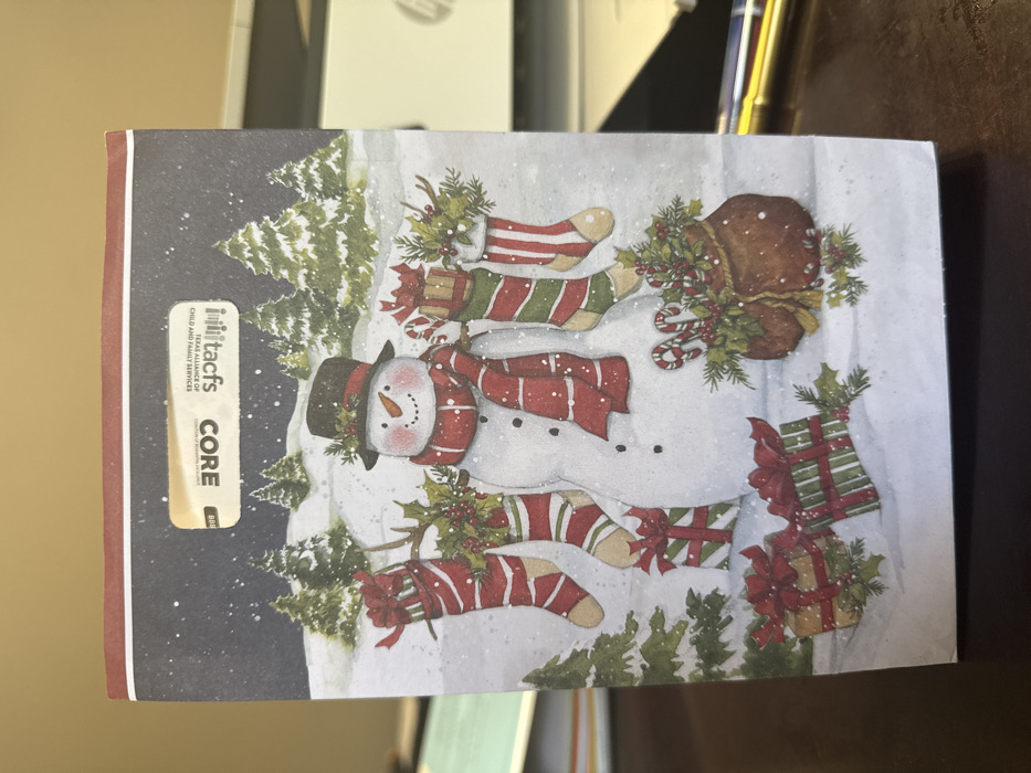 Christmas-themed notepad. The cover features a snowman with a black top hat and red scarf. It is decorated with Christmas stockings, presents, candy canes, and a burlap sack. The background includes snow-covered trees. On the left, a label reads "tacfs CORE" with the tagline "Texas Alliance of Child and Family Services." The notepad has a red binding. The image is rotated counterclockwise.