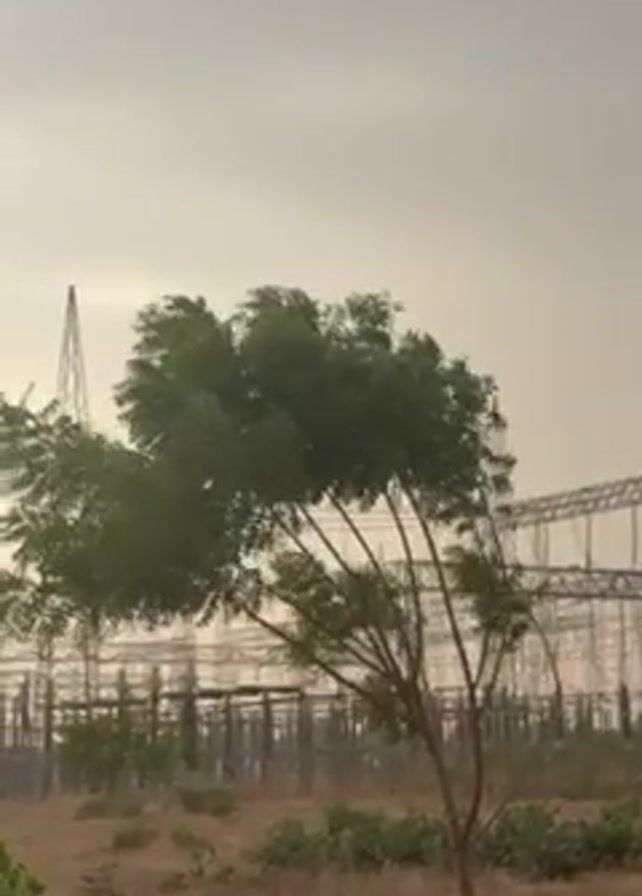 The camera shows a tree being buffeted by the wind. In the background is an electrical substation. The sky is overcast. The ground is dry and sparse.