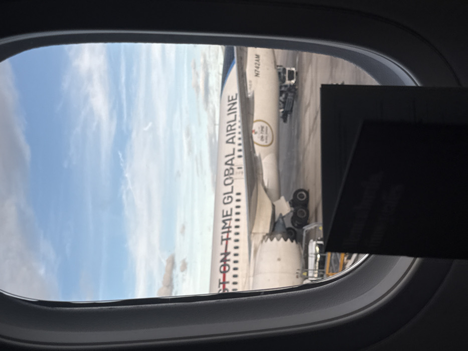 The image presents an external view through an oval, gray-framed aircraft window. A white commercial airliner, bearing the livery "ON TIME GLOBAL AIRLINE" on its fuselage and the registration N742AM below the left wing, occupies the midground. Visible aircraft components include a section of the fuselage with rows of windows, the leading edge of the left wing, and the multi-wheeled main landing gear resting on a gray tarmac surface. Below the wing and adjacent to the fuselage, partial views of ground support equipment, including what appears to be a baggage cart and an air stair, are discernible. The background consists of a clear blue sky interspersed with scattered white cumulus and cirrus clouds. In the immediate foreground, a dark, folded object, likely a menu or safety card, partially obscures the lower portion of the window frame. No individuals or specific interactions are visible. The scene is situated on the tarmac of Adolfo Suárez Madrid–Barajas Airport in Madrid, Spain.