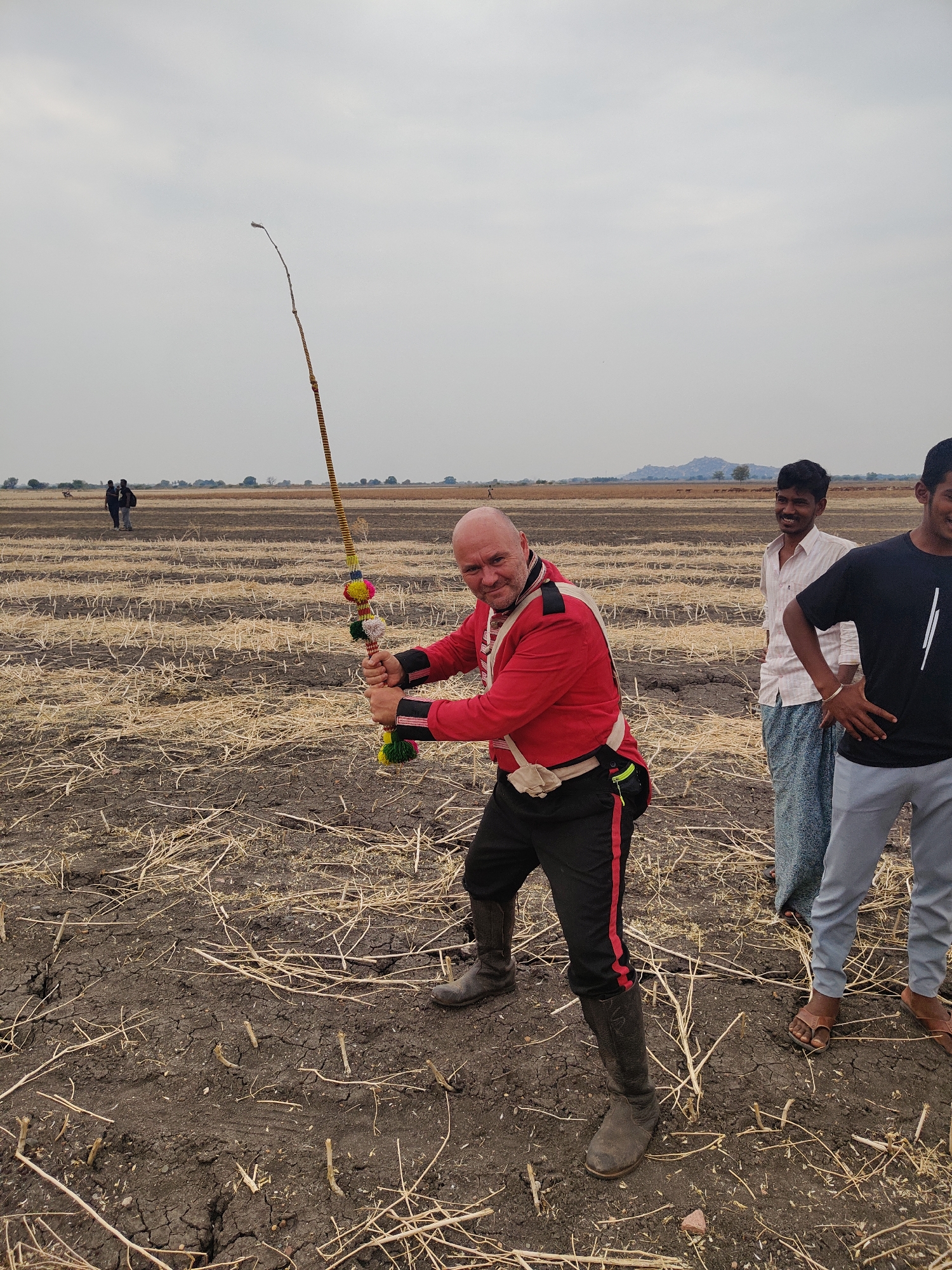 The scene is an open agricultural field in Kottalapalli, India, under an overcast, light grey sky. The ground consists of dry, dark brown soil exhibiting cracks, with scattered light brown crop stubble from a previous harvest. In the foreground, a bald Caucasian male, appearing to be in his 40s to 50s, stands centrally, facing the camera with a wide smile. He is dressed in a red, uniform-style jacket with black collar and cuff trim, black trousers featuring a red stripe down the side, and dark, knee-high boots. A light-colored pouch is attached to a belt around his waist. He holds a long, flexible, whip-like object with both hands, positioned across his body. This object is primarily striped yellow and brown and is decorated with multiple colorful pom-poms (red, yellow, green, blue) along its length, particularly near the handle. To the right of the Caucasian male, two Indian males are standing. The first, positioned slightly behind, is a young adult wearing a light-colored, possibly striped, button-up shirt and a blue-and-white patterned lungi. He is smiling towards the man in red. The second, partially visible on the far right, is also a young adult, wearing a black t-shirt and light grey trousers, with his hands on his hips. He is smiling and wears brown sandals. In the distant background, two indistinct figures are walking across the field on the left. Further to the right in the mid-ground, a group of livestock is visible. The horizon features low hills and a few scattered trees.