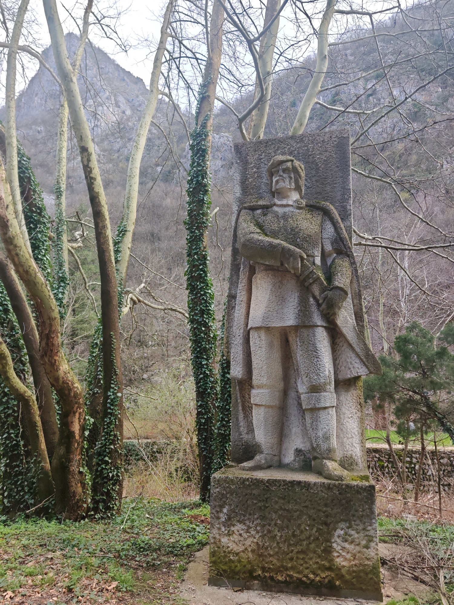stone statue of a man located in a park. The statue depicts a man in historical clothing, with a cape and what appears to be a sword or long dagger. The stone base is covered in moss. The background features trees, some covered in ivy, and a mountainous landscape. The statue is likely situated in the city of Vratsa, Bulgaria, as indicated in the prompt. The environment appears natural and somewhat overgrown.