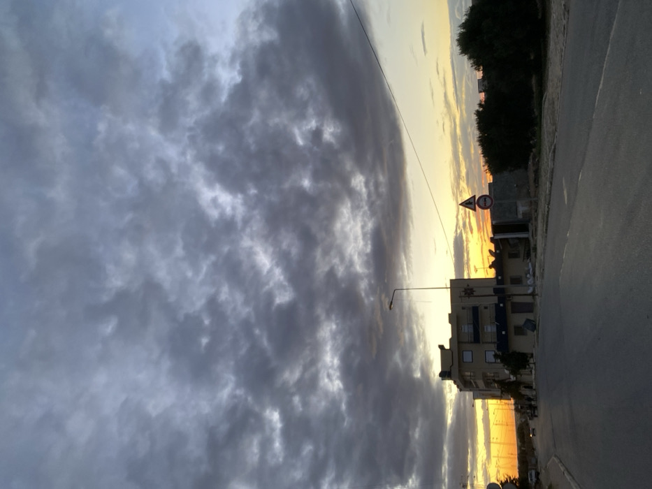 A photograph depicts a street scene under a dramatic sky at dusk. Dark, layered clouds dominate the left side of the frame, contrasting with the orange and yellow hues of the setting sun visible on the right. A street with a building and a traffic sign is present in the foreground, as well as some vegetation and street lighting.