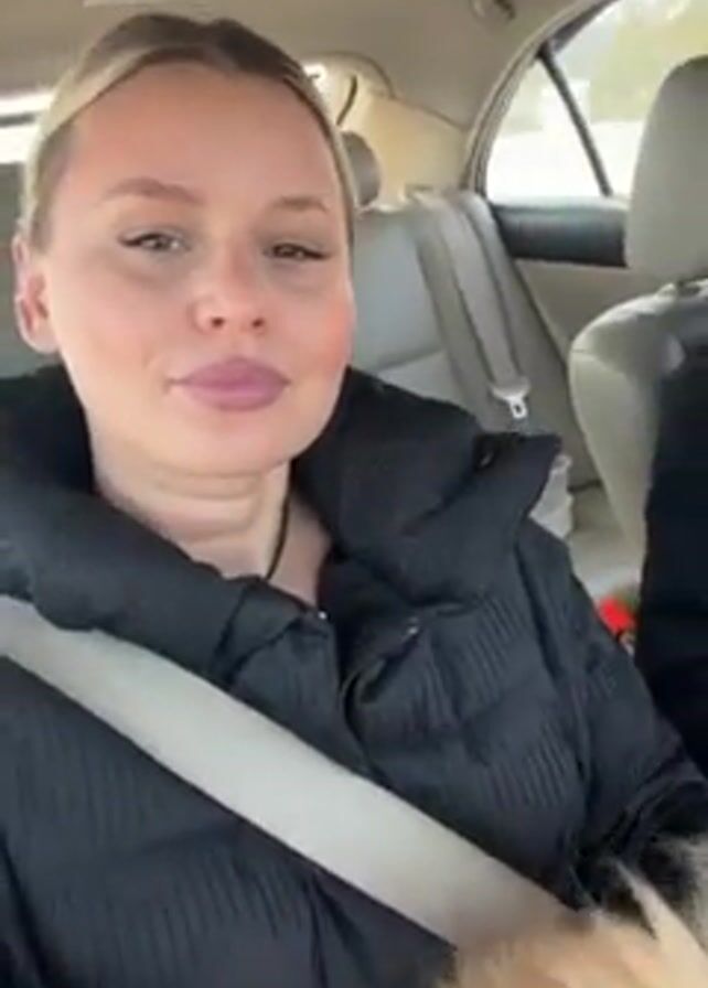 A woman in a black puffer jacket is sitting in the passenger seat of a car. She turns the camera to show a fluffy, light brown dog with its tongue hanging out. She turns the camera back to herself. There is music playing.