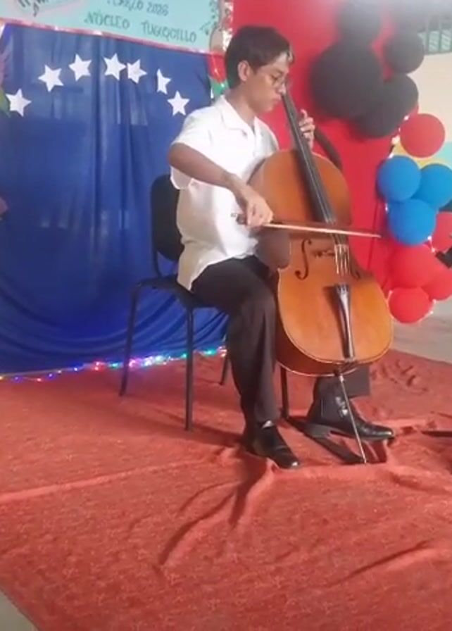 - "A young person with short hair and glasses plays the cello while sitting on a black chair on a red carpet" by FM-zBmG82, licensed under CC BY 4.0