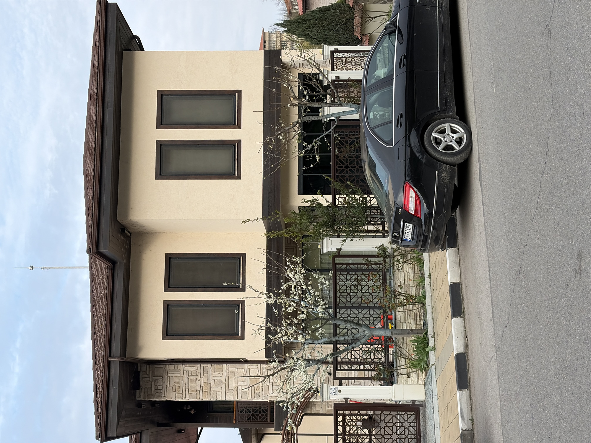 residential scene in Kazanlak, Bulgaria. A two-story house with a light beige facade and dark brown trim is visible, featuring multiple rectangular windows. A black Mercedes sedan is parked on the street adjacent to the house. A flowering tree is in front of the house, partially obscuring the entrance gate. The street is paved and marked with a black and white curb. The license plate on the car reads “CT 7914 PT”. The weather appears overcast.